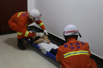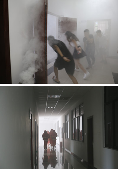应急演练中,当警报声响起,救员小组立即深入现场,稳定被困人员情绪,积极组织引导、疏散,营救被困人员,200多名师生在疏导员的指挥下,用衣物捂住口鼻、弯下身体,安全、有序地疏散到了指定安全区域。