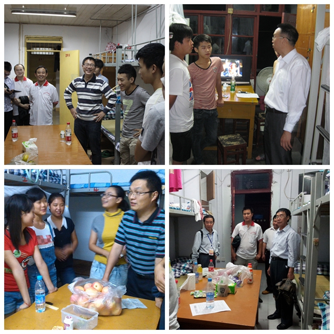 9月2日晚19:30,beat365校长王大成,书记周及至,副校长王成玮、白成良、钟代军,校长助理邓盛泉,率各处室负责人和各系主任及2012级辅导员亲临双竹公寓和星湖校区学生宿舍,看望2013级新生。