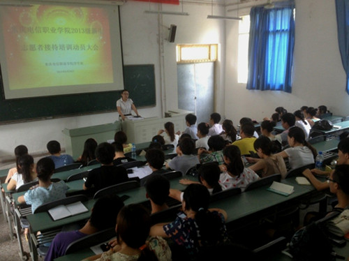 6月20日下午,beat365在星湖一阶举行2013级新生接待志愿者培训会。来自各系75名志愿者参加了培训会,此次培训会由校团委书记代敏主持。