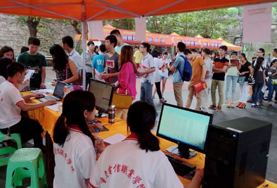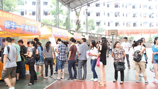 报到场上更是热火朝天,各系报到台前早已排成一条长龙,静静的等待着辅导员的“接见”。激情涌动的音乐,令新同学们心潮澎湃,不时他们也哼唱起那一首首——校园之歌。
