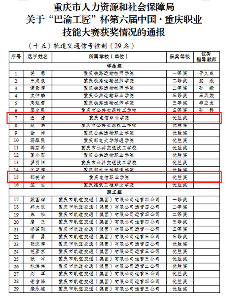 近日,由重庆市人力资源和社会保障局主办的2019年“巴渝工匠”杯第六届中国·重庆职业技能大赛圆满落幕。beat3652018级通信技术(轨道交通信号方向)专业学生汪洁、邹晓渝在“轨道交通信号控制”比赛项目中荣获优胜奖。