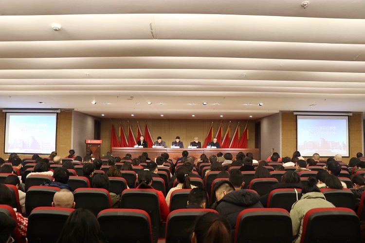校长曹继建以《新机遇 新挑战创出新佳绩、齐拼搏 共努力同铸新辉煌》为题,向大会作了全面详实的总结报告。他指出,2019年,学校始终坚持以习近平新时代中国特色社会主义思想为指导,坚决贯彻党的教育方针,深入学习全国教育大会精神,贯彻落实十九届四中全会精神,以内涵建设、规范发展为重点,以“不忘初心、牢记使命”主题教育为契机,全面落实立德树人根本任务,深入推进学校发展建设。这一年,深入学习贯彻习近平新时代中国特色社会主义思想,党的建设进一步夯实;这一年,全面推进专业建设,办学水平进一步提高;这一年,力推综合改革进程,内涵建设进一步深化;这一年,厚植校园文化筑梦,办学声誉进一步提升;这一年,强化招生规范,创新就业再创新高。同时,也指出了这一年工作存在的不足,并对学校2020年的重点工作提出了深入的谋划和长远的思考。曹继建提出,一是要持续推进教育改革,进一步提升教学质量;二是加强群团工作,进一步提升学生素质水平;三是加强队伍建设,完善教师、行政、工勤人员结构;四是持续巩固依法办学,落实规范管理机制改革;五是全力以赴做好招生工作,进一步扩大办学规模;六是加强校园文化建设,进一步提升学生的社会知名度和影响力。