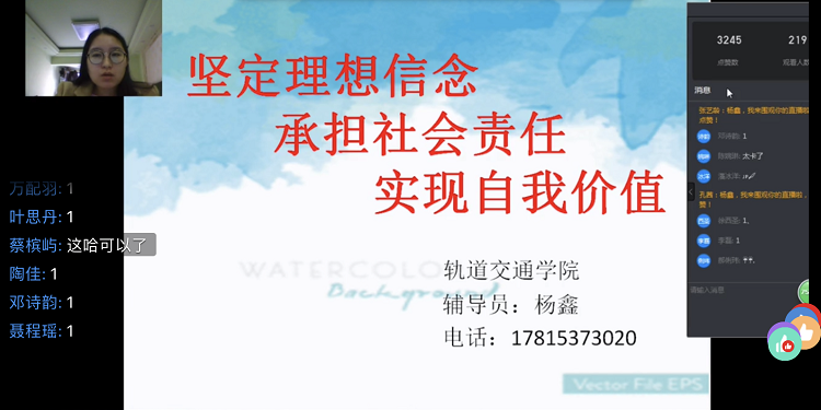 周末思想政治教育课堂是学校一直以来立足学生思想建设的一项重要举措。 3月1日,是网上开课的第一个周末,各二级学院辅导员、班主任结合当下疫情和班级实际情况,通过网络视频平台开展了主题思想教育,把坚定理想信念、承担社会责任、实现自我价值等主题结合当下疫情防控战中的先进典型和感人事迹转化为教学资源,融入周末思政教育课堂,引导广大学生提高思想意识,深刻理解中国精神的深刻内涵。课后,本次思政课引发了广大师生的积极讨论。