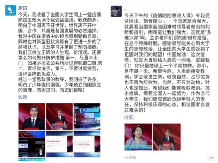 此次“疫情防控思政大课”由清华大学马克思主义学院教授艾四林,中国人民大学马克思主义学院教授秦宣,北京师范大学马克思主义学院教授王炳林,中央财经大学马克思主义学院教授冯秀军等四名专家学者结合“马克思主义基本原理概论”“毛泽东思想和中国特色社会主义理论体系概论”“中国近代史纲要”“思想道德与法律基础”四门思政必修课,解读了党中央关于疫情防控的决策部署,分析了中国抗疫彰显的中国共产党领导和中国特色社会主义制度的显著优势,讲述了防疫抗疫一线的感人故事,发挥了高校思政课落实立德树人根本任务的关键作用,有力增强了当代大学生的爱国主义精神和对中国特色社会主义的道路自信、理论自信、制度自信和文化自信。