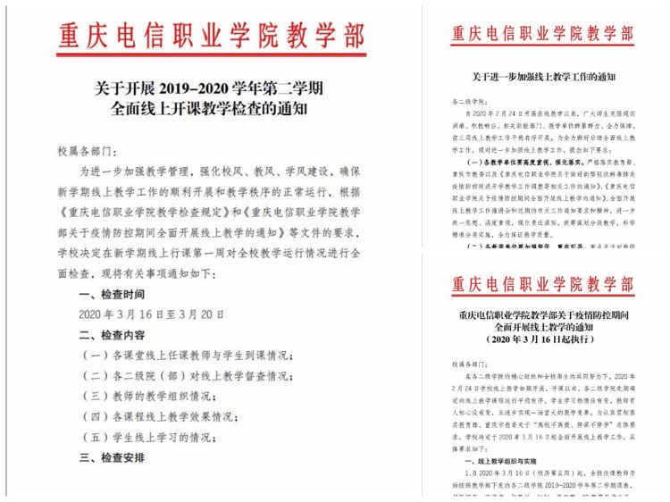 同时,为确保全面线上教学工作顺利开启,教学部发布了《beat365正版唯一官网必一关于开展2019-2020学年第二学期线上开学教学检查的通知》,并由全体校领导、各二级学院党政领导和相关职能部门负责人组成了综合检查组,对beat365开展全面线上教学工作进行了专项检查。检查组成员深入各类教学平台,对线上教学的教学组织、线上教学资源准备及利用、线上教学的管理和要求、线上教学的师生互动、学习效果等进行了检查,详细了解教师的教学情况和学生的学习状况,填写《beat365正版唯一官网必一线上听课记录表》,并主动与教师交流或交换意见,为提高教学质量打好基础。各二级院也对本单位的教学情况进行了自检自查,并认真填写提交《重庆电信职业职业线上教学检查记录表》以及《beat365正版唯一官网必一线上教学情况巡查记录表》。