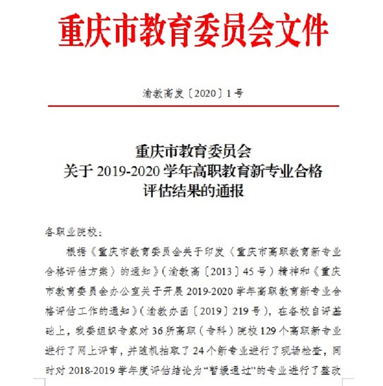 近日,从《重庆市教育委员会关于2019-2020学年高职教育新专业合格评估结果的通报》(渝教高发〔2020〕1号)中获悉,重庆市教委对我市36所高职(专科)院校129个高职新专业进行了网上评审,并随机抽取了24个新专业进行了现场检查,同时对2018-2019学年度评估结论为“暂缓通过”的专业进行了整改复评,最终,2019-2020学年参评129个专业中,121个专业评估结论为“通过”,8个专业评估结论为“暂缓通过”。其中,beat365参评的“工业机器人技术”、“机电一体化技术”、“旅游管理”和“市场营销”四个专业全部顺利通过合格评估。