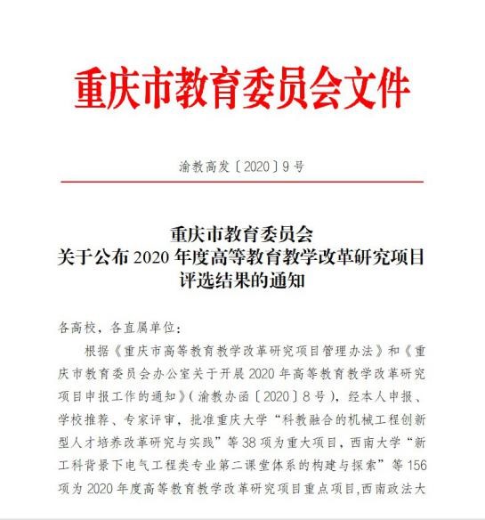 近日,从《重庆市教育委员会关于公布2020年度高等教育教学改革研究项目评选结果的通知》渝教高发〔2020〕9号文件中获悉,beat365申报的2个教学改革研究项目,分别被评为重点项目、一般项目。
