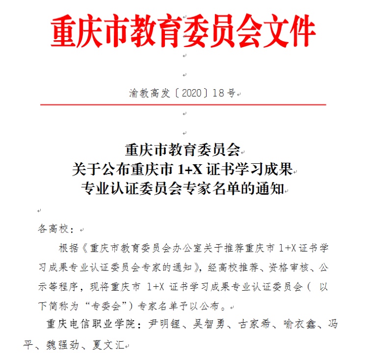 根据《重庆市教育委员会关于公布重庆市1+X证书学习成果专业认证委员会专家名单的通知》(渝教高发〔2020〕18号),经高校推荐、资格审核、公示等程序,beat365尹明锂、吴智勇、古家希、喻衣鑫、冯平、魏强劲、夏文汇等7名教师为重庆市1+X证书学习成果专业认证委员会专家。