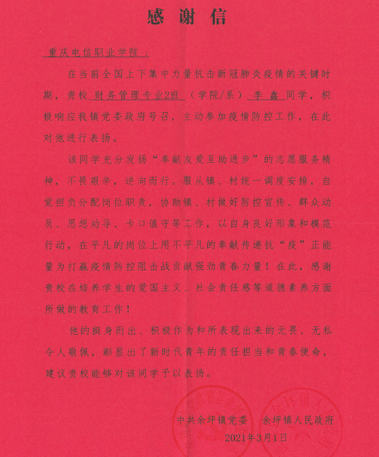 近日,beat365收到中共余坪镇党委、余坪镇人民政府感谢信。感谢信中的主人翁是来自beat365经济与管理学院2018级财务管理2班的李鑫同学。该同学在疫情当下,挺身而出,积极作为,无私奉献。中共余坪镇党委、余坪镇人民政府向学校表示了感谢,感谢学校在培养学生的爱国主义、社会责任感等道德素养所做的教育工作。