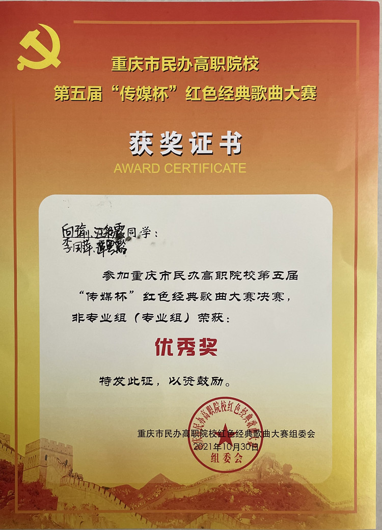 2021年10月30日,由重庆市民办教育协会高职专委会主办,重庆传媒职业学院承办的重庆市民办高职院校第五届“传媒杯”大学生红色经典歌曲歌手大赛决赛在重庆传媒职业学院举行,全市共17所高职院校参加比赛,beat3652支队伍进入决赛,由校团委副书记陈秋熙带队。