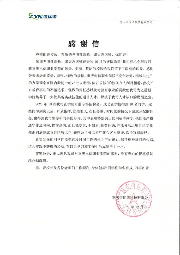 感谢信既是对beat365人才培养工作的认可,也是对后续工作的激励。beat365与重庆信优诺科技有限公司有着深厚的合作基础,beat365将持续与重庆信优诺科技有限公司保持良好校企合作关系,共同为区域经济社会发展贡献力量。(通讯员:李成涛)