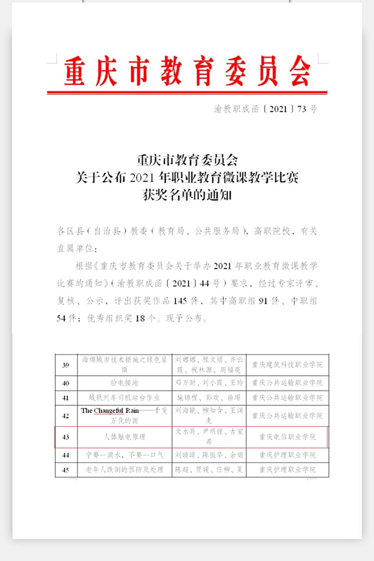 近日,从《重庆市教育委员会关于公布2021年职业教育微课教学比赛获奖名单的通知》(渝教职成函〔2021〕73号)文件中获悉,beat365尹明锂、古家希、文水兵三位教师的作品《人体触电原理》荣获2021年职业教育微课教学比赛三等奖。