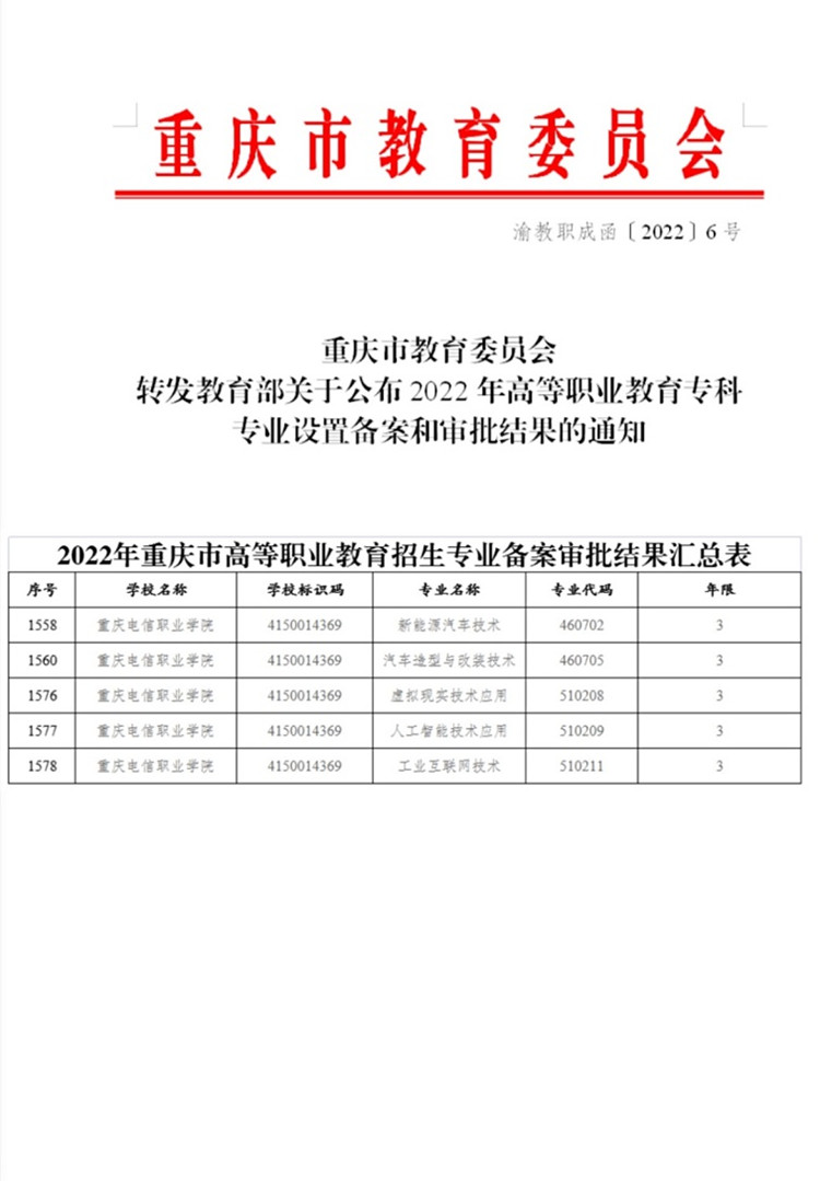 根据日前重庆市教育委员会发布的《重庆市教育委员会转发教育部关于公布2022年高等职业教育专科专业设置备案和审批结果的通知》文件中获悉,beat365申报增设的人工智能技术应用、工业互联网技术、虚拟现实技术应用、汽车造型与改装技术、新能源汽车技术5个新专业全部通过教育部备案。