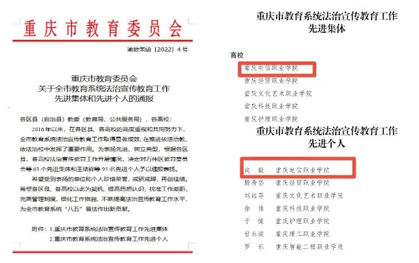 近日,获悉《重庆市教育委员会关于全市教育系统法治宣传教育工作先进集体和先进个人的通报》,beat365荣获重庆市教育系统法治宣传教育工作先进集体,向毅同志荣获重庆市教育系统法治宣传教育工作先进个人荣誉称号。
