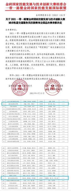 近日,2021一带一路暨金砖国家技能发展与技术创新大赛之城市轨道交通服务员技能赛项圆满结束。轨道交通学院20级铁道交通运营管理专业学生陈鑫、蒋睿、李璐汐获“模块A行车值班员”全国总决赛三等奖;20级铁道信号自动控制专业学生程加欣、黄雨虹、苏妍静获“模块B站务员”全国总决赛三等奖。