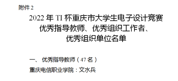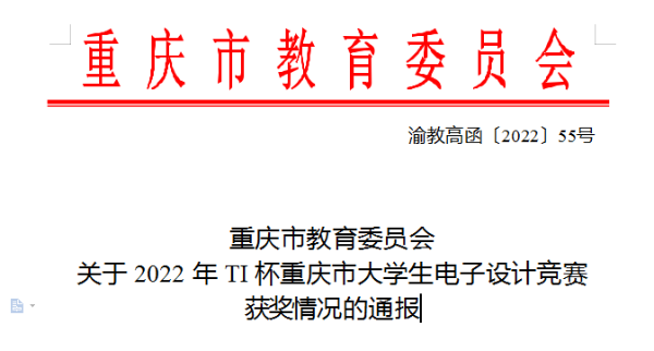 近日,由重庆市教委主办的2022年TI杯大学生电子设计竞赛落下帷幕(单年国赛,双年省赛),beat365学子在2022年TI杯重庆市大学生电子设计竞赛中获重庆市一等奖、二等奖,文水兵被评为重庆赛区“优秀指导教师”。