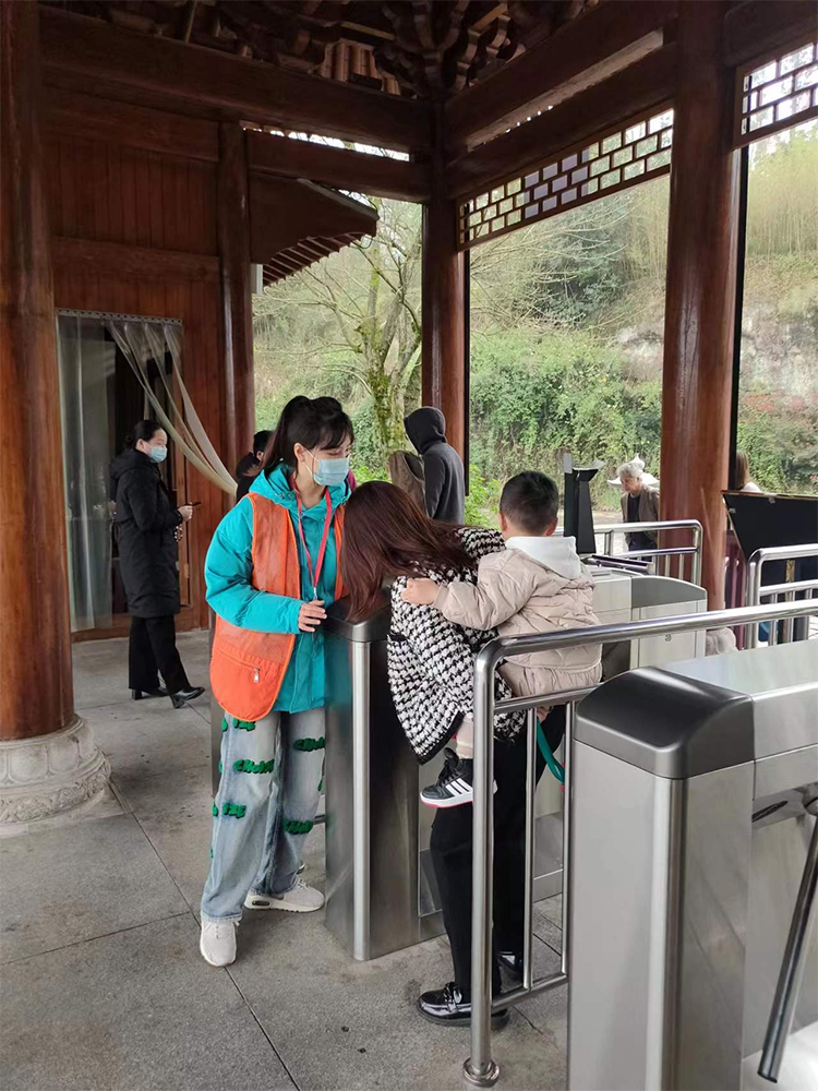 "您好,前面可以乘坐观光车"、"您好,请勿跨越,请走通道"、"你好,请出示身份证"。在景区内,志愿者分散到游客中心咨询台、广场、停车场、观光车、检票点等处,有的为游客提供路线引导,有的为游客提供票务咨询,有的在人流量较大区域提供秩序维护,有的则不时提醒游客保护环境卫生,共同营造文明出游氛围。