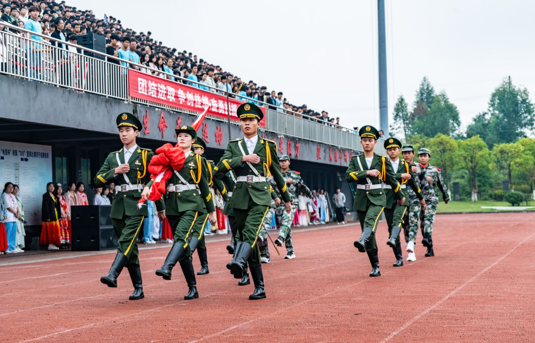 轨道交通学院的红裙飞舞,舞步大气磅礴,寓意国与家的深厚情感,展现了国的强大与家的祥和。
