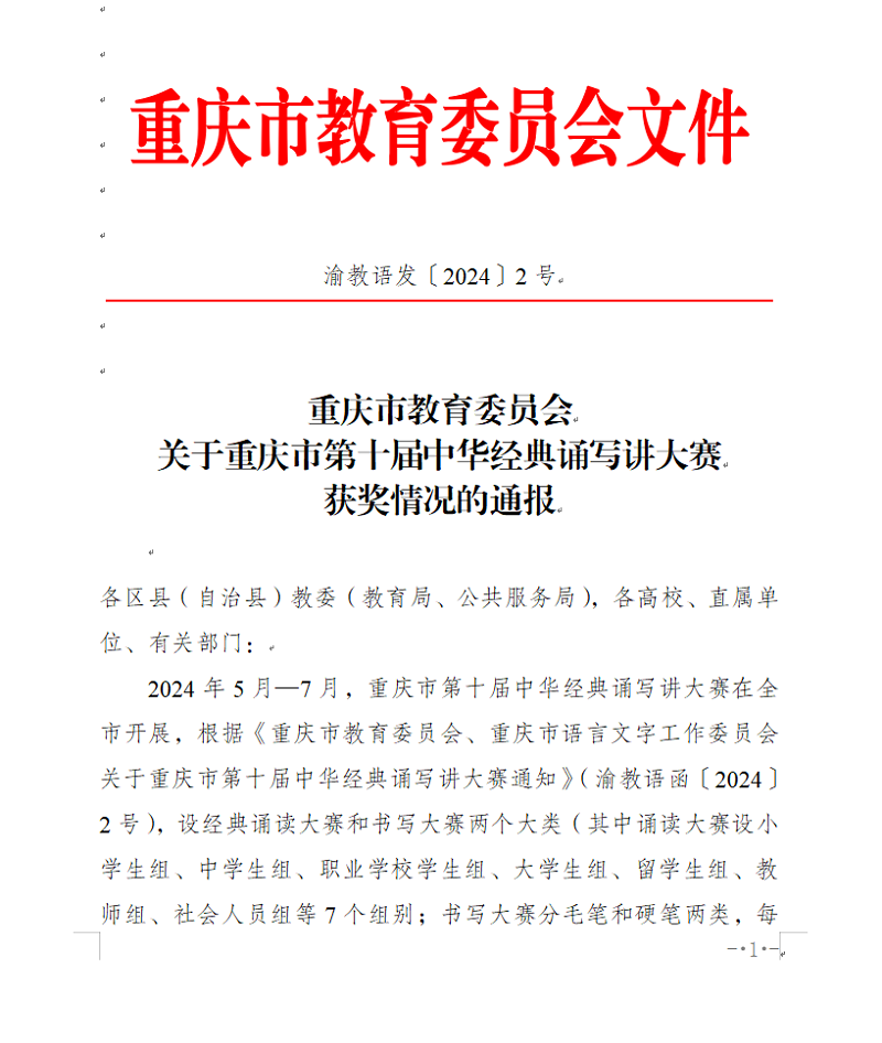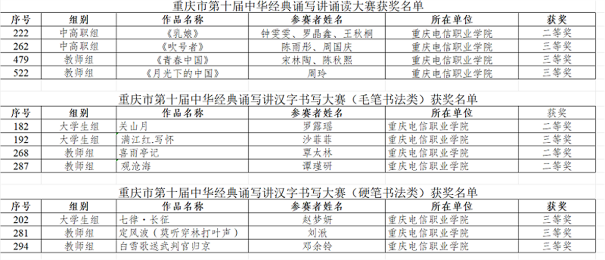 近日,重庆市第十届中华经典诵写讲大赛落幕,此次大赛由重庆市教育委员会、重庆市语言文字工作委员会主办,设经典诵读大赛和书写大赛两个大类,beat365师生积极参与,经过激烈的角逐,其中4个诵读、7个书法作品,共计11个参赛作品获奖,再次突破参加此项比赛的历史最好成绩。