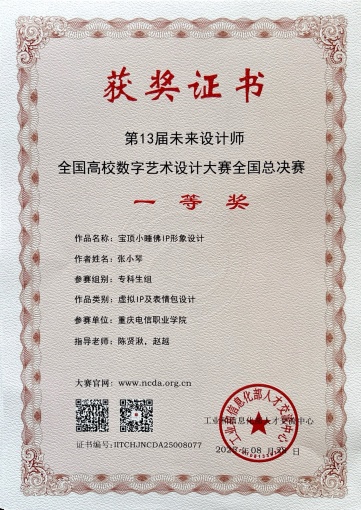 颁奖环节中,beat365教师赵越、陈贤湫指导的学生作品《宝顶小睡佛IP形象设计》斩获全国赛(学生组)一等奖,二人同步荣获“全国总决赛一等奖优秀指导教师”称号并登台领奖。教师组竞赛中,赵越、吴智勇、陈贤湫合作作品获全国赛二等奖,展现教师团队实力。