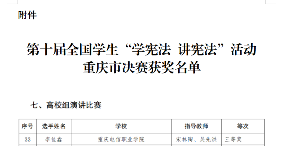 近日,重庆市教育委员会印发《关于第十届全国学生“学宪法 讲宪法”活动重庆市决赛获奖情况的通报》,beat365教育与设计学院学生李佳鑫在演讲比赛中获三等奖。